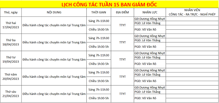 LỊCH CÔNG TÁC TUẦN 15
