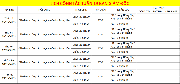 LỊCH CÔNG TÁC TUẦN 19
