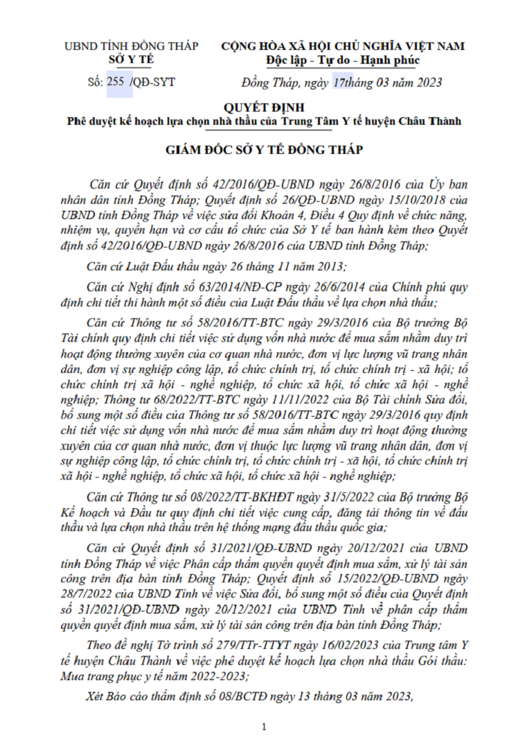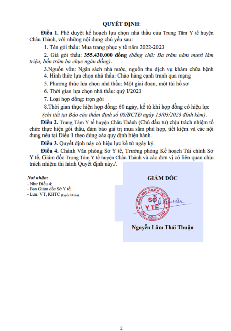 Phê duyệt kế hoạch lựa chọn nhà thầu của Trung Tâm Y tế huyện Châu Thành