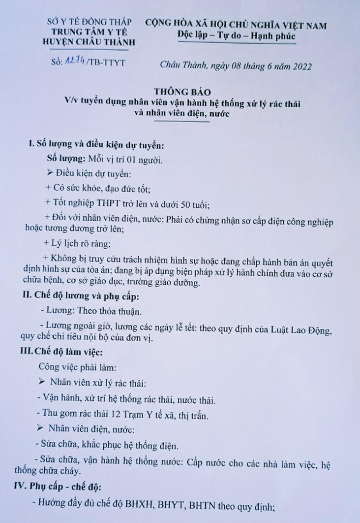 V/v tuyển dụng nhân viên vận hành hệ thống xử lý rác thải và nhân viên điện, nước